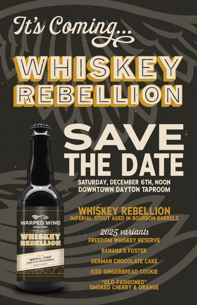 EVENT DETAILS • Date & Time: Saturday, December 6th – doors open at noon • Location: Warped Wing Dayton Taproom, 26 Wyandot Street, Dayton • Bottle Line: Starts outside at the loading dock (draft-only guests can enter through the front) All variant bottles will be available to purchase starting at noon – just the draft will be hourly releases • Flight Club members get early access from 11am-12pm – please note: the kitchen will not be open until noon